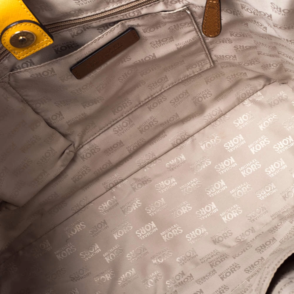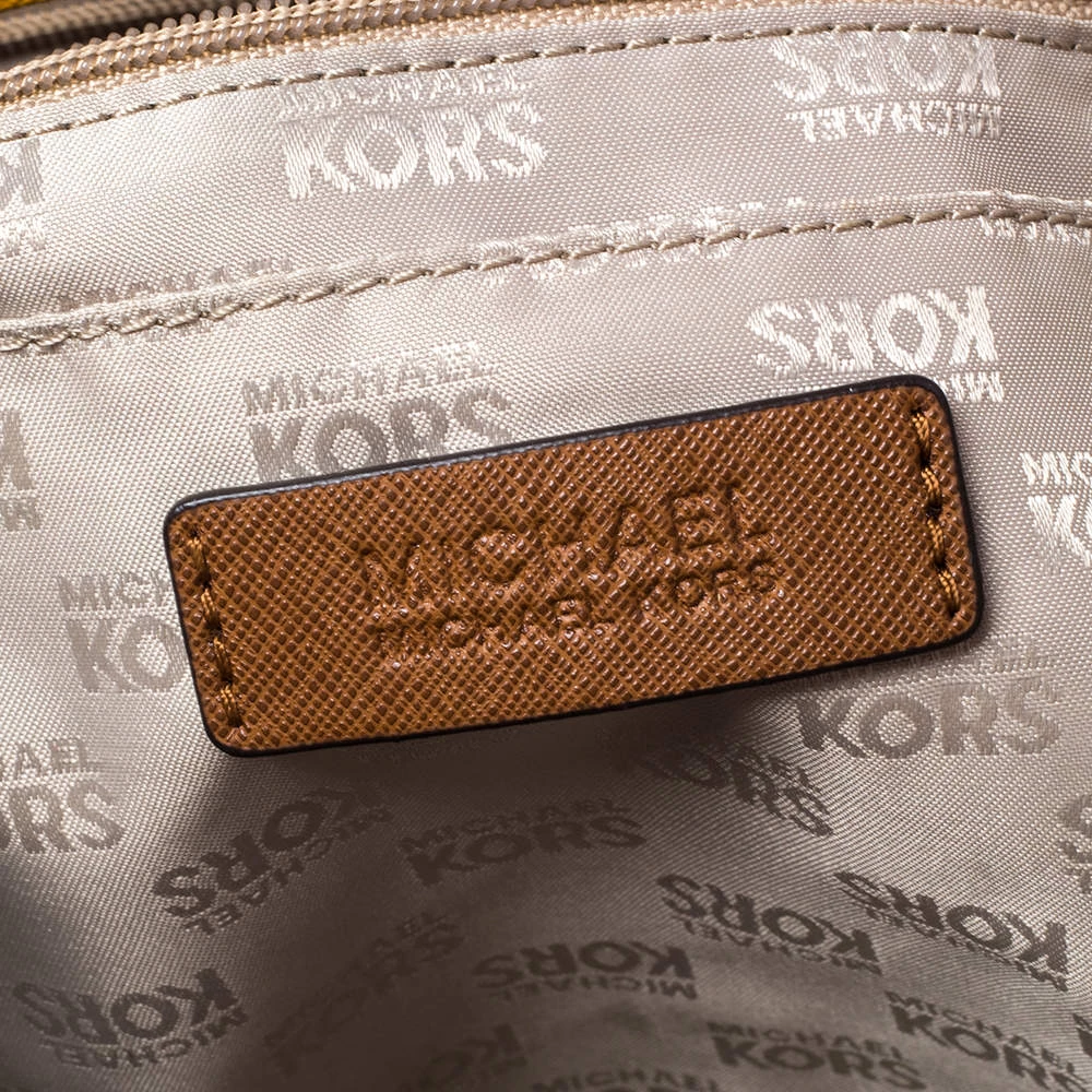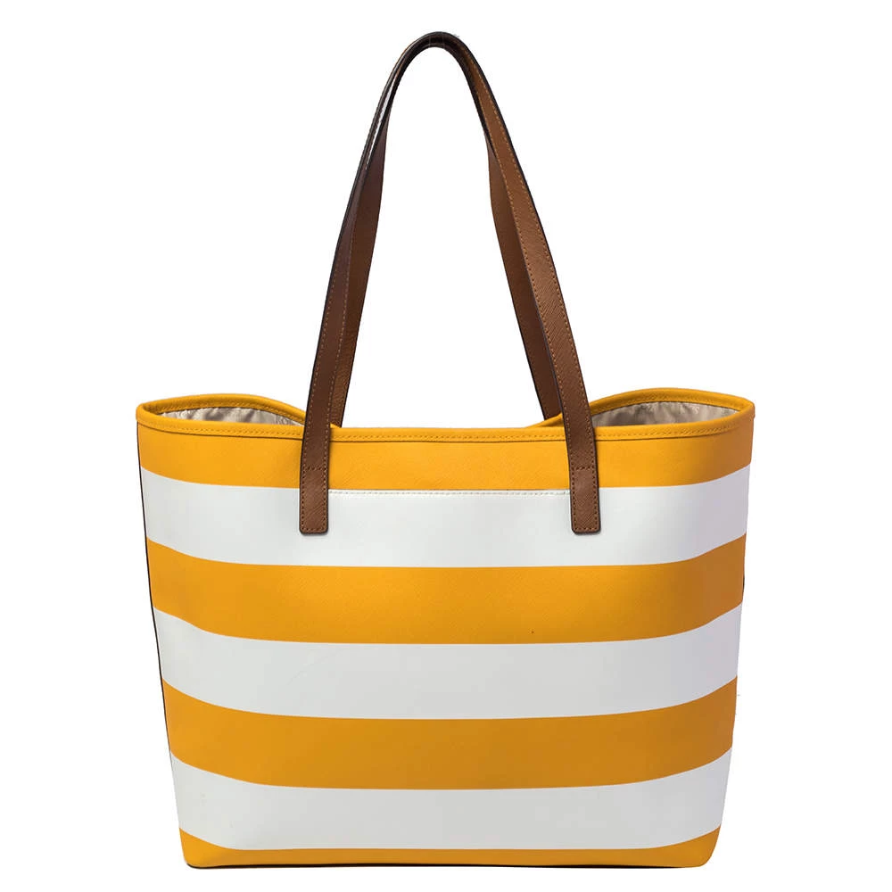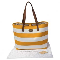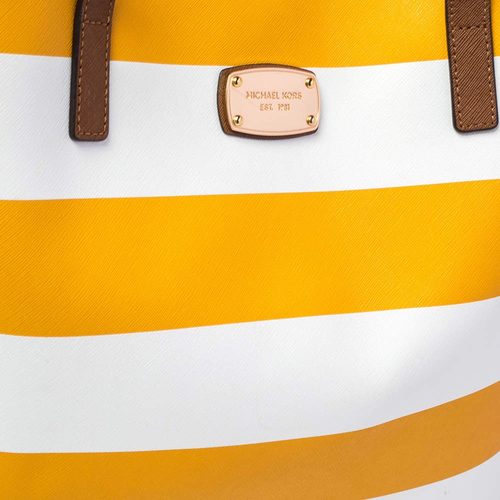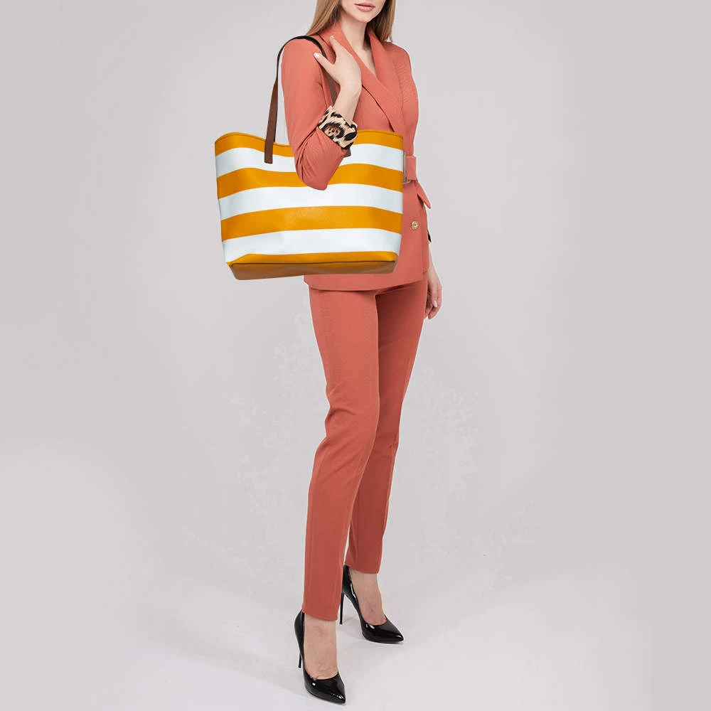 Timelessly elegant and stylish, MICHAEL Michael Kors collections capture the effortless, nonchalant finesse of the modern woman. Crafted from leather with yellow and white stripes, this chic Jet Set tote features a spacious interior with a top snap fastening. The sleek, understated silhouette is punctuated with gold-tone hardware.